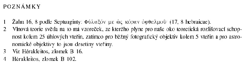 Zřítelnice oka je znakem rozhraní nitra a vnějšku. Znakem naší prostorovosti, ale i rozhraním mezi vším prostorovým a vším skutečnějším, co není jen zdrojem vidění, ale také hmatání a všeho dalšího. Ostatně i ke zkušenosti prostoru potřebujeme hlavně svůj vlastní pohyb, nejen vidění očima. To vidění je jakousi zkratkou a znakem pro naše prostorové zakoušení a orientaci. Napřed jsem to musel zažít, pak mě to pohled může připomenout. Zřítelnice oka je snad znakem možností orientace a rozlišování, zatímco hmat a chuť spíš znakem vnitřní souvislosti. Jedině spojitost těchto schopností umožňuje lidský život. Oko nás živí božským jasem krásy světa, zatímco hmat a chuť nás živí silami země. Každá z našich schopností by nás zavedla, pokud by se zahleděla sama jenom do svých vlastních tendencí.